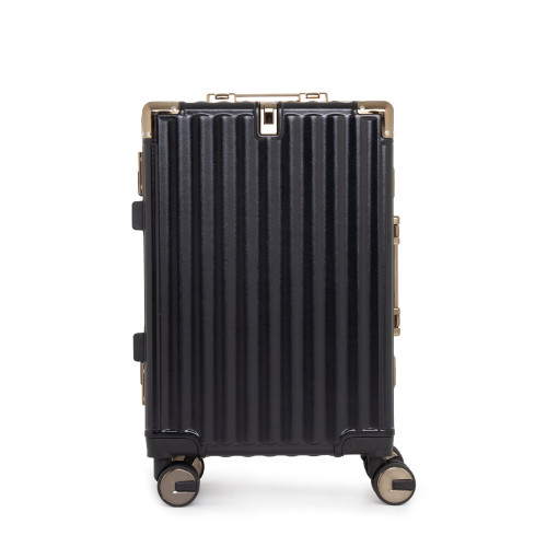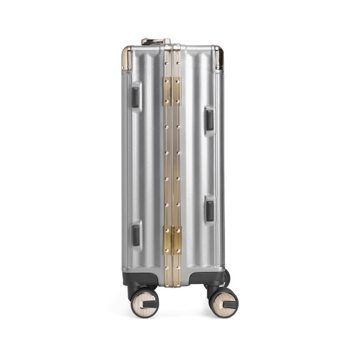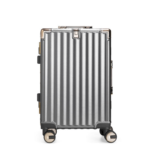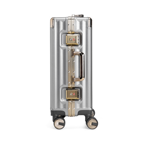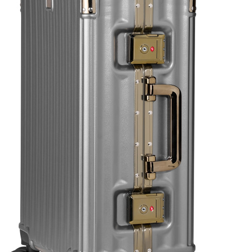 Descrição: Mala de viagem 38 litros feita em plástico com acabamento em alumínio, contém cadeado numérico TSA. Compartimentos internos com bolso telado, bolso plástico para itens molhados e cinta compressora para roupas. A mala possui duas alças de mãos, puxador retrátil com regulagem de tamanho, suporte porta bolsa, quatro rodinhas 360º e apoios laterais.