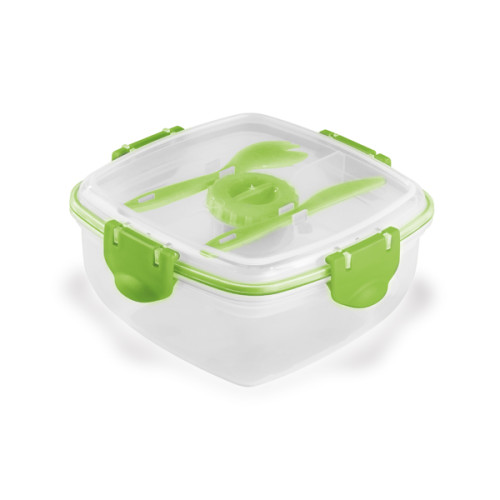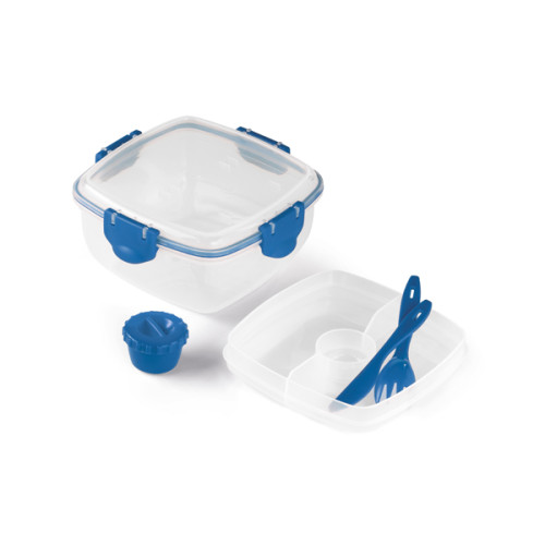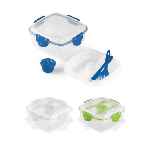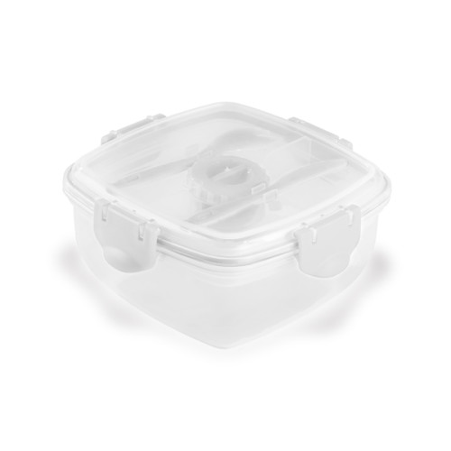 Marmita em PP com 3 compartimentos e capacidade até 1.200 ml. Apta para microondas (retirar a tampa). Incluso garfo, faca e molheira. Food grade. 175 x 175 x 87 mm