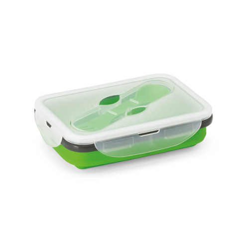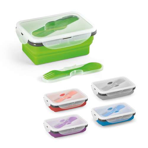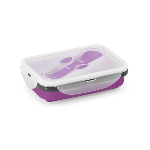 Marmita retrátil. Silicone e PP. Com 1 compartimento e talher 2 em 1 (garfo e colher). Capacidade: 640 ml. Food grade. 170 x 110 x 66 mm | Dobrada: 170 x 110 x 40 mm