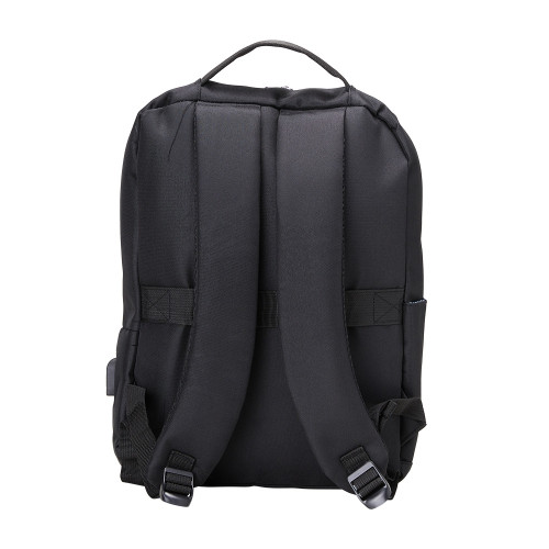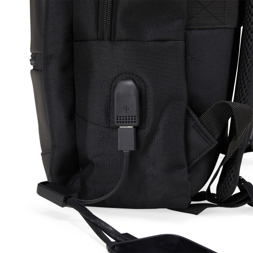 Descrição: Mochila de nylon 26 Litros com detalhes em couro sintético e quatro compartimentos, sendo o principal com bolso para notebook 15,6. Com divisórias internas para acessórios, a mochila possui bolso lateral, suporte externo USB e alça para engate em malas de viagem.