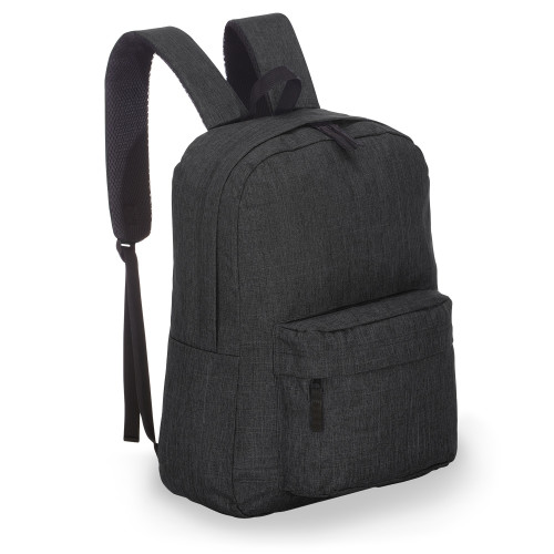 Descrição: Mochila de poliéster com compartimento principal superior e compartimento frontal, possui zíperes com pegadores de nylon, alça de mão em nylon e alças para costa ajustáveis com revestimento espumado.