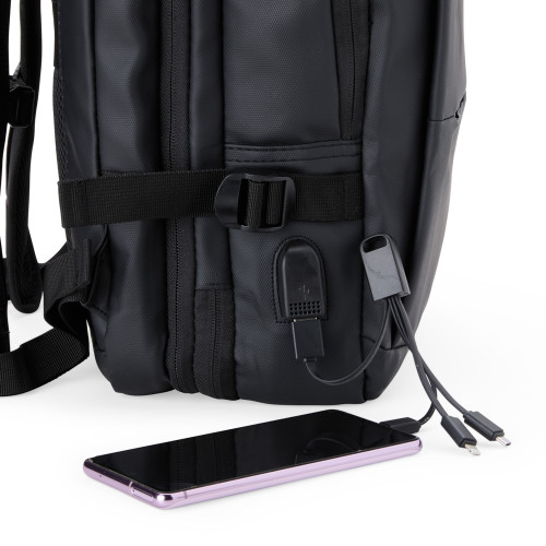 Descrição: Versátil e amplo espaço, nossa mochila de 36 litros atende às necessidades do escritório a viagens profissionais, unindo funcionalidade e visual executivo. Com design expansivo, permitindo aumentar sua capacidade de carga quando necessário, é resistente à água e combina a sofisticação do couro sintético com a versatilidade para o dia a dia. Possui três compartimentos, sendo um deles para notebook de até 15,6” e espaço para tablet. Outro compartimento que se destaca é o expansivo, com fivelas ajustáveis. Este espaço possui abertura lateral e inclui uma cinta compressora para deixar as peças presas e seguras. Além disso, a mochila possui uma alça na lateral, transformando-a em uma mala quando desejar, compartimentos como bolsos interno, divisórias para acessórios, entrada para USB, alças ajustáveis e de compensação para distribuir o peso de forma mais equilibrada, engate para mala de viagem garantindo mais praticidade ao caminhar, dois bolsos na parte frontal com fechamento por zíper e para deixá-la mais completa acompanha uma plaquinha de metal, permitindo a personalização exclusiva. Essa mochila é perfeita para o seu cliente levar tudo o que precisa e mais um pouco!
