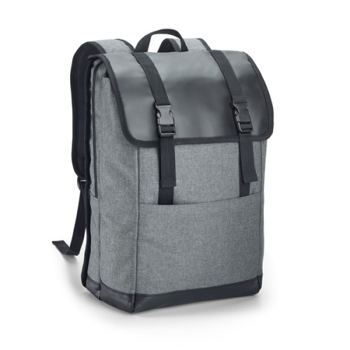 Mochila para notebook. 600D de alta densidade e tarpaulin. Com 2 compartimentos. Compartimento posterior forrado, com diversos bolsos interiores e 2 divisórias almofadadas para notebook até 17'' e tablet 10.5''. Compartimento frontal forrado, ideal para transporte de roupa (ou para lazer). Bolso frontal. Parte posterior e alças almofadadas. 300 x 430 x 150 mm