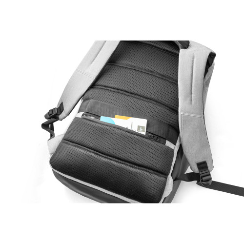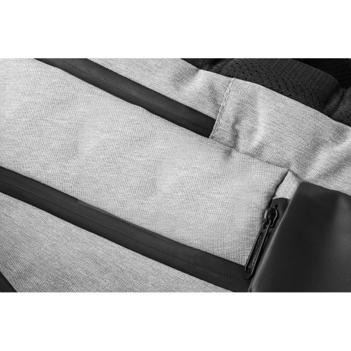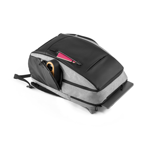 Mochila premium em poliéster 900D com tarpaulin, ideal para brindes corporativos de alto padrão e uso executivo. Possui dois compartimentos principais com divisórias internas, sendo um totalmente acolchoado para notebook até 17”, além de bolsos frontais, laterais com zíper e bolso oculto traseiro.