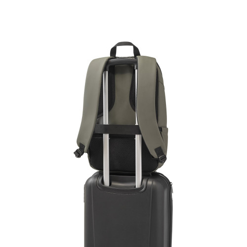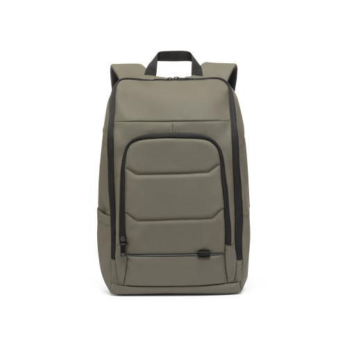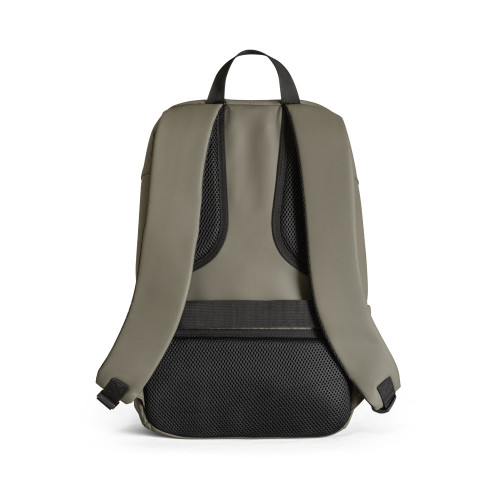 Descrição: Mochila confeccionada em poliéster reciclado (100% rPET) de alta densidade, com revestimento resistente à água e forro interno também em material reciclado, sendo uma opção sustentável e funcional para o dia a dia.