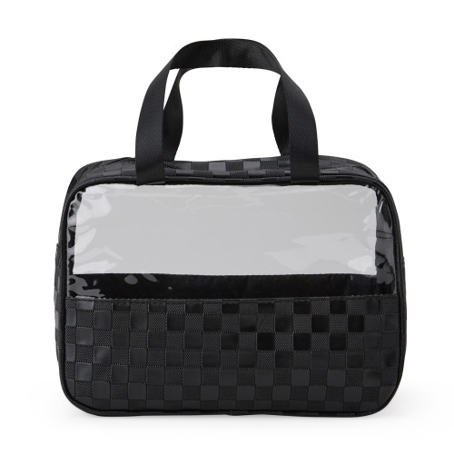 Descrição: Nécessaire de PVC e couro sintético impermeável em xadrez . Possui visor transparente e duas alças laterais de mão em nylon.