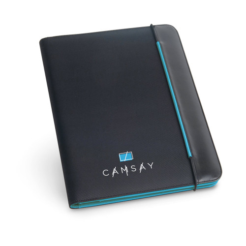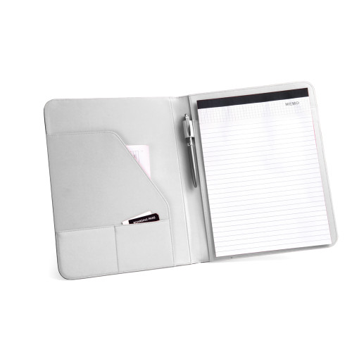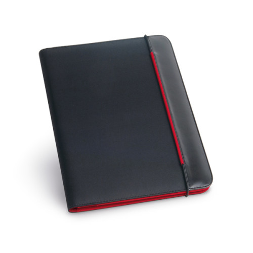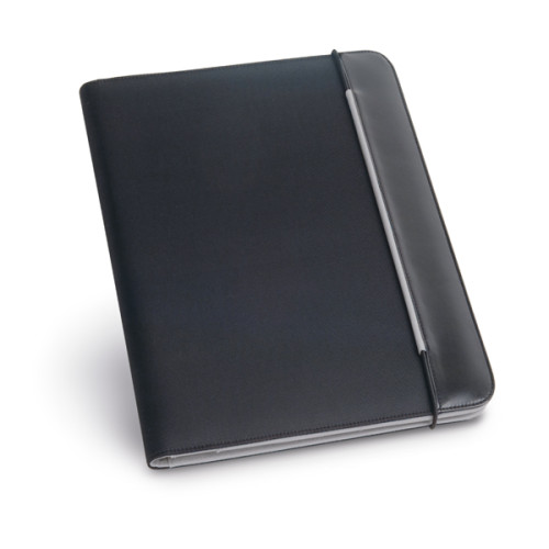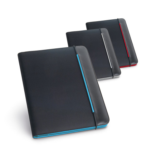 Pasta A4 em c. sintético e 800D com o interior em microfibra. A pasta contém um elástico para fechar e no seu interior inclui um bloco de 20 folhas pautadas, 3 bolsos e suporte para esferográfica (não inclusa). 245 x 315 x 15 mm