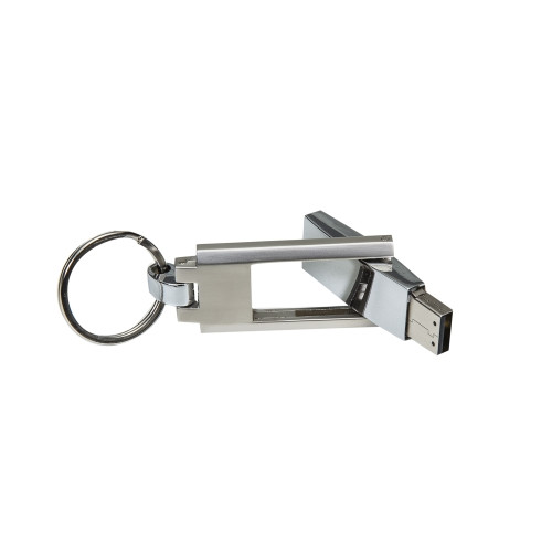 Brinde corporativo robusto e de alto valor percebido. Pen drive em metal com chaveiro, acabamento fosco e compartimento giratório, com gravação a laser (área 3,9x1,5 cm) — ideal para clientes premium e ações estratégicas.