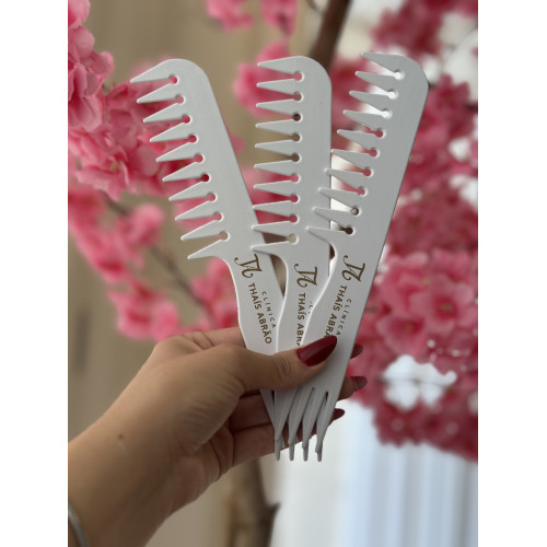 Pente com dentes largos para uso diário. Pode ser usado em todos os tipos de cabelos. Auxilia na separação de mechas, pois o cabo também possui dente. É indicado para pentear cabelos cacheados e crespos, pois ele facilita o desembaraço e a finalização de alguns tipos de penteados. Para a maior duração de seus pentes, o ideal é higieniza-los uma vez por semana utilizando sabão neutro.