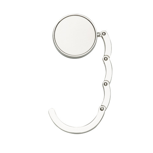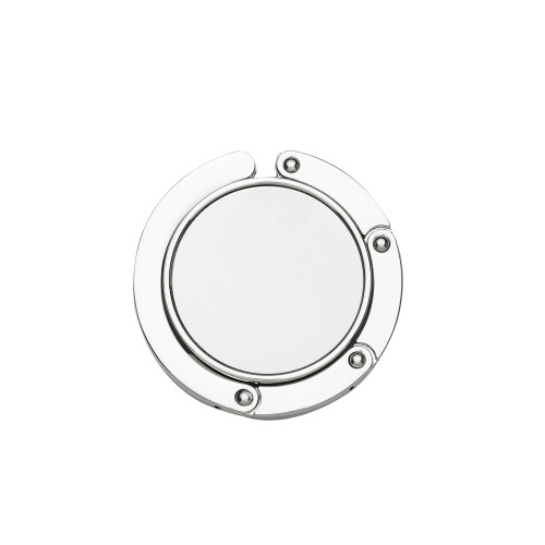 Descrição: Porta bolsa de metal dobrável, possui chapa central redonda para gravação e parte traseira borracha anti deslizante. Para utilizar o porta bolsa basta puxar a lateral(é imantado) e abri-lo.