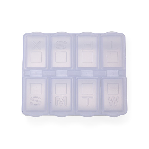 Descrição: Porta comprimido semanal em material plástico. Cada divisória contém a letra inicial referente o dia da semana(em inglês), possui oito divisões sendo a última para comprimido extra.
