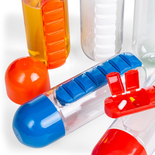 Descrição: Squeeze 700 ml plástico com porta comprimido. Garrafa transparente com encaixe para bandeja de comprimidos colorida, especificado por siglas referente os dias da semana, possui quatro “pezinhos” no qual auxiliam o squeeze a ficar na posição horizontal. Tampa rosqueável colorida.