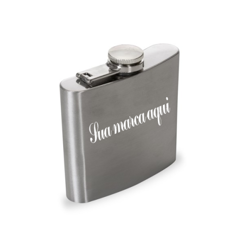 Descrição: Porta whisky de inox com capacidade 177 ml (6 oz), tampa de rosca sustentada por suporte na lateral superior.