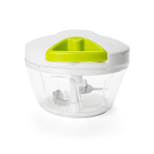Descrição: Processador de alimentos manual, tampa plástica de polipropileno branco com puxador verde, pote transparente em poliestireno com relevo e lâminas em aço inox.