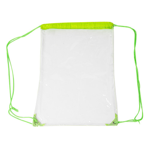 Descrição: Mochila Saco em PVC transparente com detalhes em tecido nylon, alças reguláveis e dois ilhós metálicos.