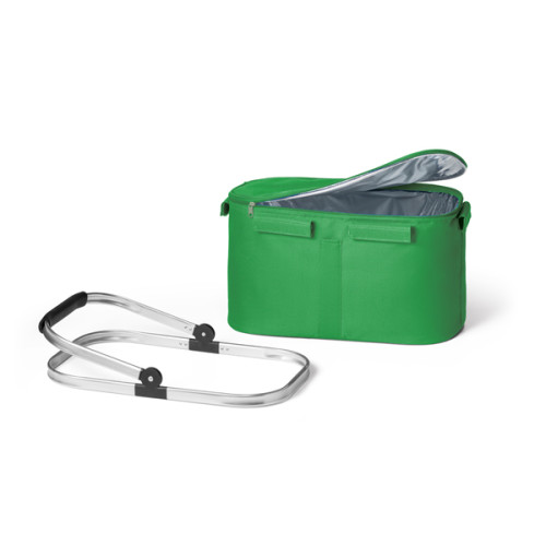 Sacola térmica flexível. 600D. Com zíper duplo e interior forrado. Estrutura removível em alumínio, com pega ergonómica em EVA. Capacidade até 14 L. Food grade. 460 x 250 x 270 mm