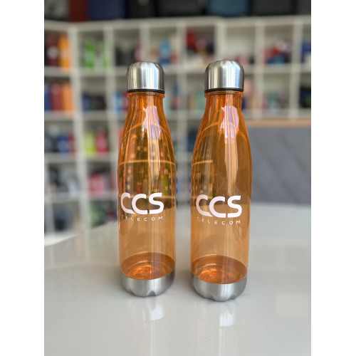 Squeeze plástico 700 ml formato garrafa. Corpo transparente colorido, possui tampa e base em alumínio.