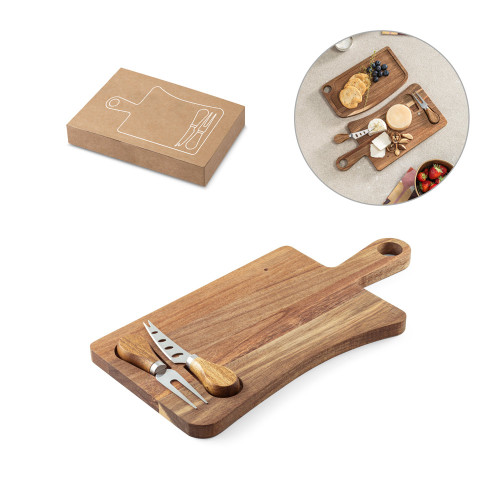 Tábua de queijos em madeira de acácia, proveniente de gestão florestal sustentável, com pega. Incluso 2 utensílios em madeira de acácia e aço inox: uma faca e um garfo, tendo uma ranhura com magnetismo para prender os talheres. Conjugue esta tábua com a Haven II - 54289 - para completar o conjunto. Fornecido em caixa presente em papel kraft reciclado. Certificação EU Food Grade. A cor e o resultado da impressão nos materiais naturais pode variar entre produtos. 363 x 181 x 15 mm