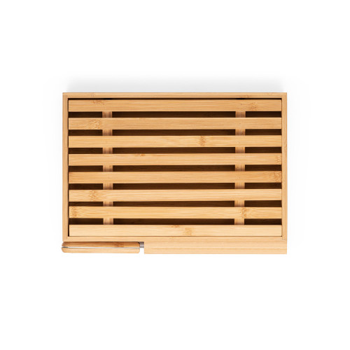 Tábua para pão em bambu com faca em aço inox. Grelha removível para fácil remoção de migalhas. Fornecido em caixa presente em papel kraft reciclado. Certificação EU Food Grade. Por ser um produto composto por materiais naturais, a cor e tamanho do produto e o resultado da impressão podem variar entre produtos. 350 x 250 x 40 mm